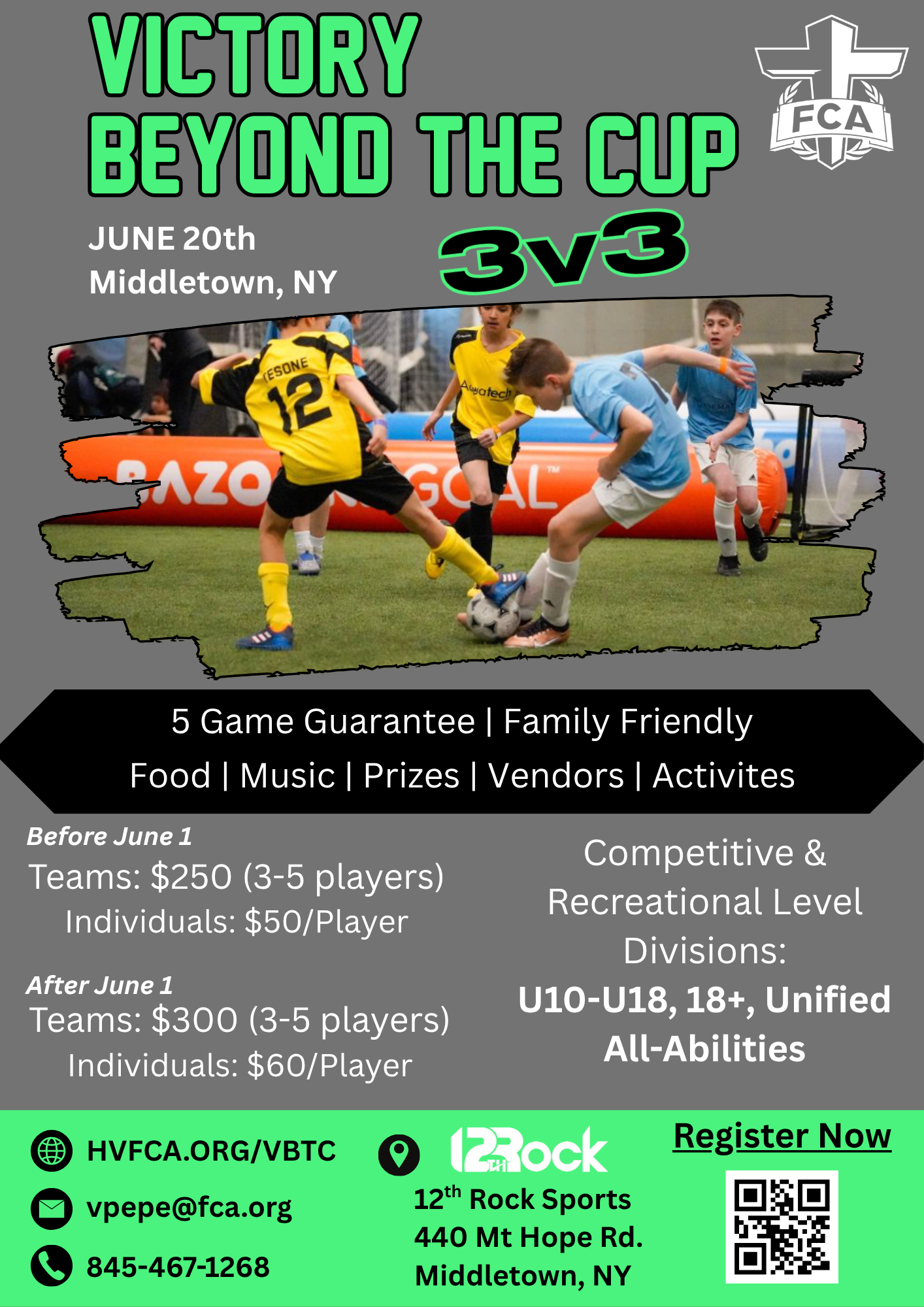 The Victory Beyond the Cup 3v3 Tournament will bring athletes, families, and community partners together for a day of soccer inspired by the excitement of the World Cup. This event creates opportunities for connection, encouragement, and meaningful impact across the Hudson Valley.